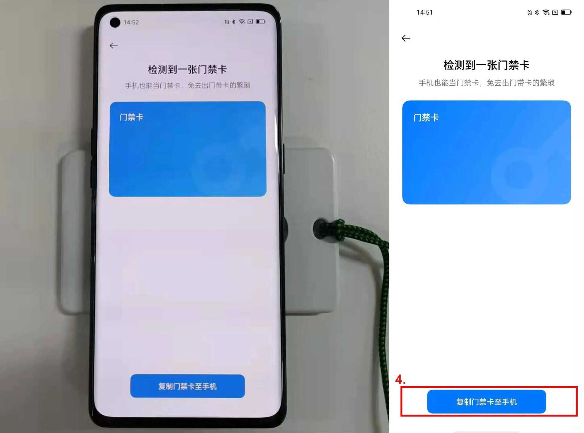2、将想要录入的卡片紧贴手机背部(这里以门禁卡为示例),此时会弹出一个框,在框内点击“复制门禁卡”至手机