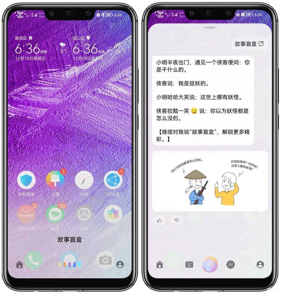 打开华为的语音助手,召唤出“小艺”,然后我们对手机说出:故事盲盒,小艺听到后便会随机给你讲述小故事,如果你的宝宝想听睡前小故事,你就可以打开它,让小艺随机抽取故事讲给宝宝听。