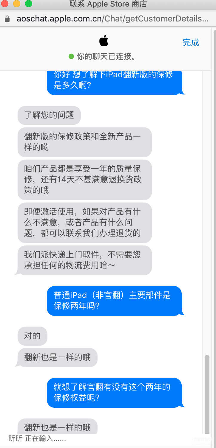 而小雷在苹果官网咨询在线客服后,得到的答复还是“官翻iPad享受同等的售后权益”。要承认的是,苹果官方在官翻产品的售后政策上,出现了自相矛盾的情况,很容易误导用户。