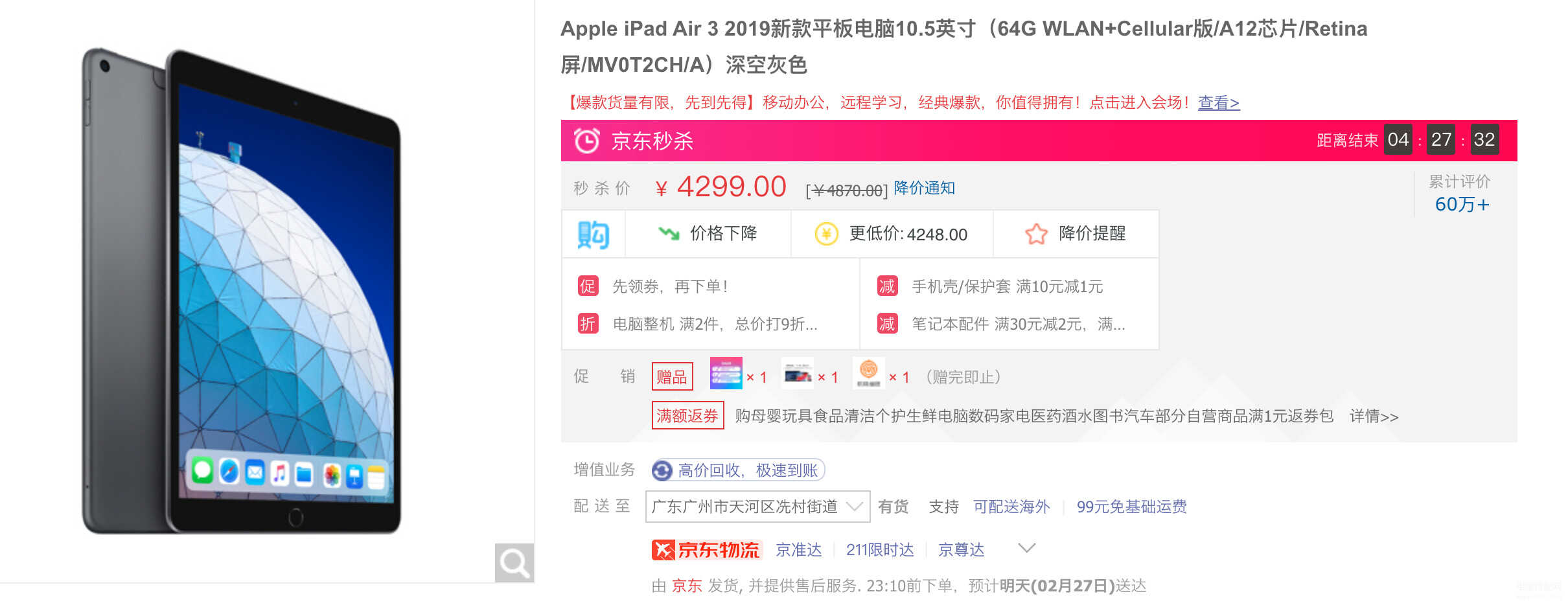 以苹果官网在售的官翻iPad Air 3 64GB LTE版为例,售价为4249元;而京东自营的同款产品(全新非官翻),售价4299元。虽然后者贵了50元,但多了一年售后,显然更有购买价值。