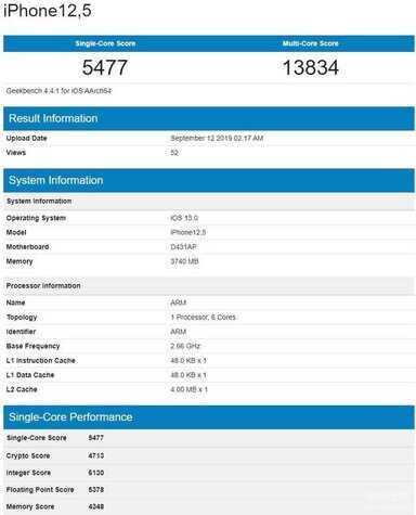 今天OneLeaks爆料称iPhone 11系列最高配了6GB内存,可惜这则消息并不准确,因为全新发布的iPhone 11三款手机的跑分数据已经上传GK4数据库中。