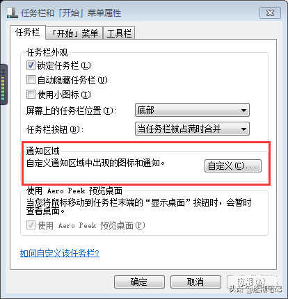 二、在弹出的任务栏和[开始]菜单属性中选择通知区域的“自定义”按钮;