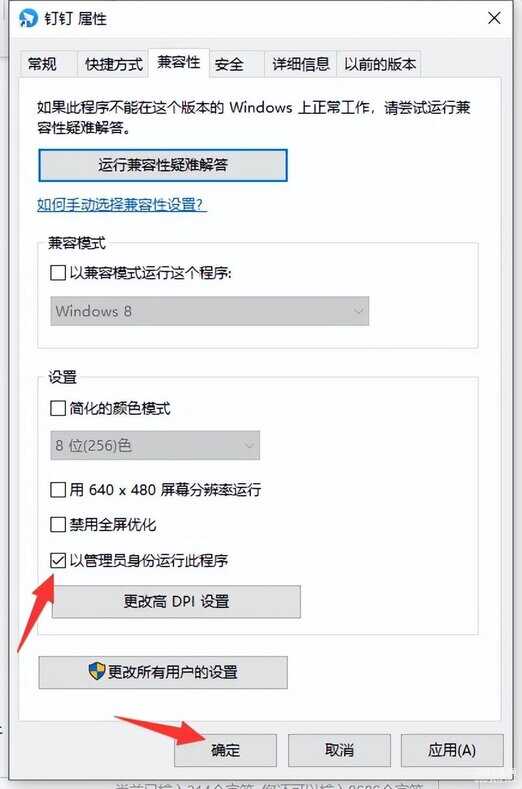 5、因为有时候一些涉及系统设置的应用需要系统管理员权限才能运行,点击”兼容性“,然后勾选”以管理员身份运行“,确认即可。
