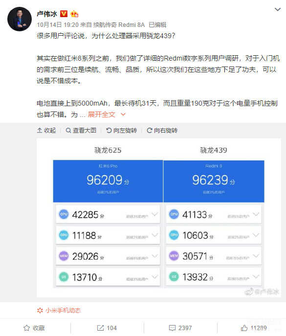 昨日,红米正式发布了旗下入门手机红米 8系列,但其搭载的骁龙439处理器遭到不少网友吐槽。对此小米副总裁卢伟冰在微博对骁龙439的性能进行了解答。