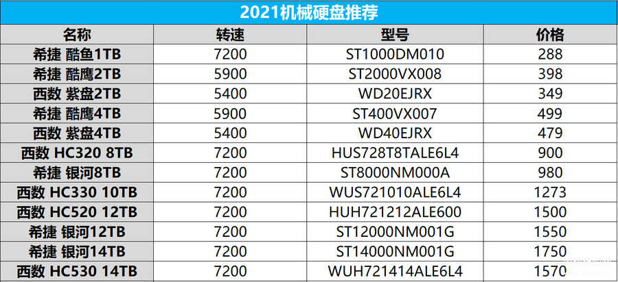 而各品牌根据用户具体的使用情况,也分别推出了不同系列的产品,比如普通台式机硬盘(西数蓝盘、东芝P300等)、企业级硬盘(希捷银河等)、NAS专用硬盘(西数红盘、希捷酷狼等)、监控硬盘(西数紫盘、希捷酷鹰等),一般购买普通台式机硬盘就可以满足日常对机械硬盘的需要了。其实不同类型的盘同样可以通用,只是各自特性相对更适合,不必太过纠结,选购时更要注意硬盘的性能。