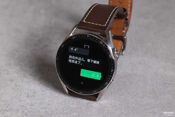 重要的来了!如果收到语音消息会是什么样呢?微信手表版会加载语音消息,同时自动把语音转文字显示。不管是收到的语音消息还是自己发出的语音消息,都可以在手表上播放出来,只不过举着手表听语音太奇怪了。