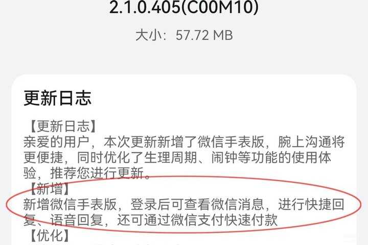 我们手里的华为手表型号是华为WATCH GT3,已经是基于HarmonyOS2系统。在推送2.1.0.405系统更新的时候,更新日志里标注新增微信手表版。还没看到微信手表版的小伙伴也不用去应用商店查找,等着推送更新就行。
