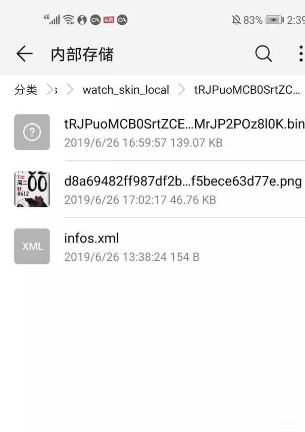 接着,打开小米运动,按照常规方式随便同步一个表盘(最好是你不喜欢的,因为它即将被替代为你自制的表盘)。同步好后,打开手机的文件管理,然后依次打开 内部存储—Android—data—com.xiaomi.hm.health—files—watch_skin_local,然后你就能看到几个文件夹,都是你之前同步过的表盘,选择一个刚才你同步的表盘(以吾皇为例),打开,可以看到里面包含了3个格式分别为bin、png、xml的文件。