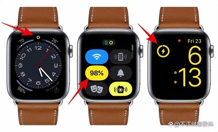 激活后,您的 Apple Watch 将在顶部显示一个黄色圆圈图标,表示低功耗模式已开启。控制中心的电量百分比图标、充电动画和床头柜模式的时间也会变成黄色。