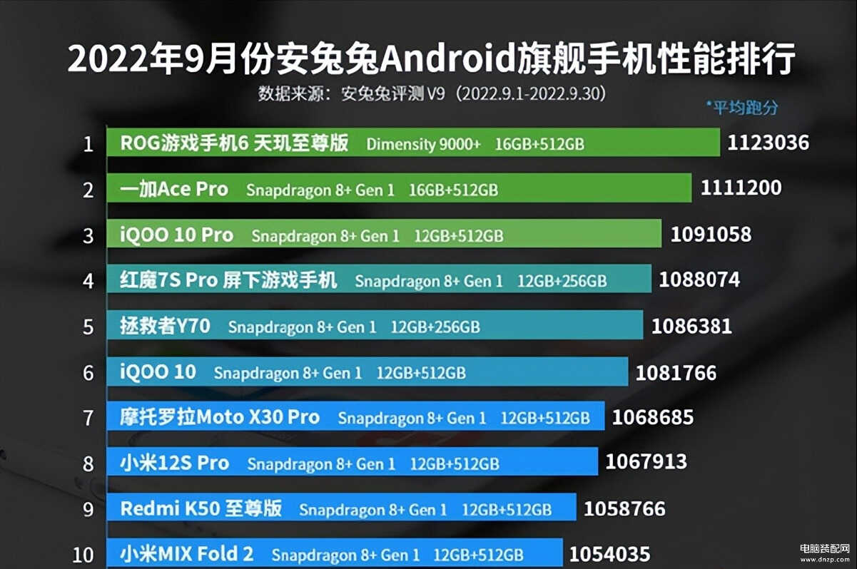 九月份的安卓手机处理器性能排行榜,天玑9000+处理器排行第一。