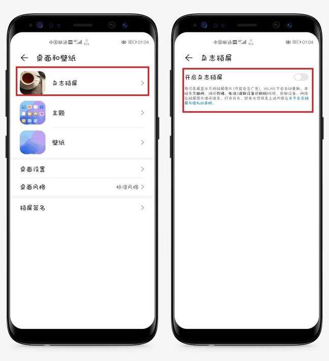 我们可以打开【设置】,在设置里找到【桌面和壁纸】,然后选择第一个【杂志锁屏】,进来后,将【开启杂志锁屏】的开关给关掉就可以了。