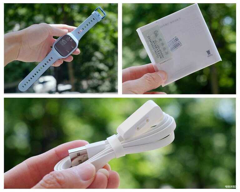 打开米兔儿童电话手表5C包装,里面除了手表外,还有一根磁吸充电线、一本使用说明书、以及一个开卡槽的取卡小工具。