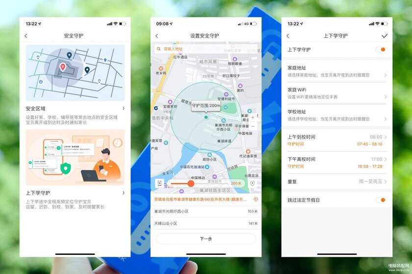 我们可以根据娃的日常活动范围,比如家周围、常去的公园等地点,给她在手机地图中划出一片安全区域(可以手动设置范围半径),当她离开这片区域的时候,手机就会及时收到通知提醒,上班也不用担心她跑的太远。还能设置上下学守护,指定时间内上学到校,或放学到家都会给手机推送消息,时刻让家长安心。