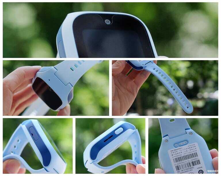 前置一颗200万像素高清大广角摄像头,配合左上方麦克风孔,可以进行语音视频通话。手表表带非常的柔软,采用食品级表带,呵护孩子柔弱的肌肤。手表左侧为Nano-SIM卡槽,支持4G全网通,移动、联通、电信卡均可使用。手表右侧为电源键和喇叭口;背面上方为磁吸式充电接口,配合附带的充电器即可轻松完成充电,非常的快捷。