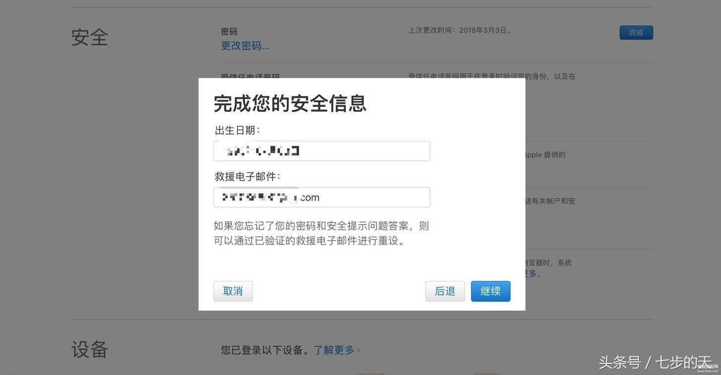 (13)填写好出生日期和救援电子邮件之后点击“完成安全信息”弹框中的“继续”按钮,等待一会即可完成关闭双重认证功能。如图