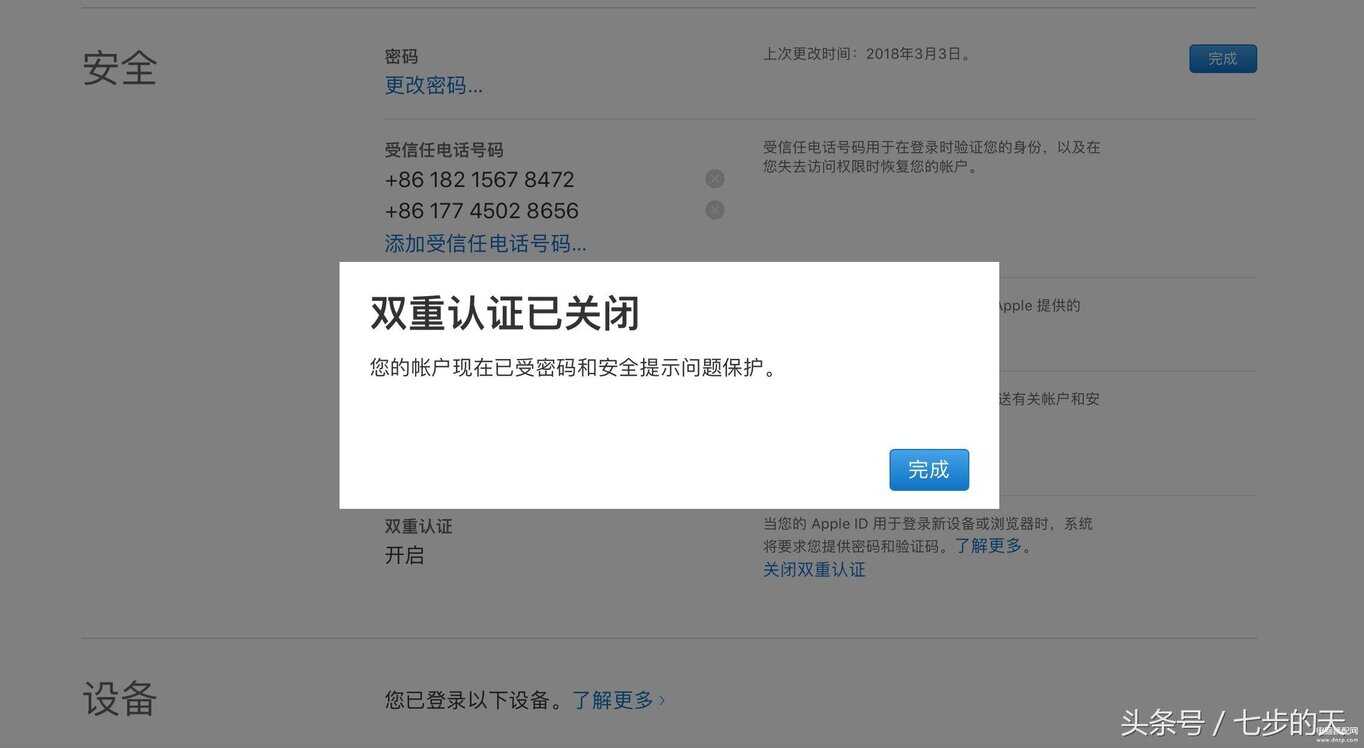 (10)点击蓝色的“关闭双重认证”功能字样,为了再次确认操作会弹出“关闭双重认证”的弹框。并且在弹框中说明了关闭双重认证以后,当前的Apple ID 帐户只受密码和安全提示问题保护。如图
