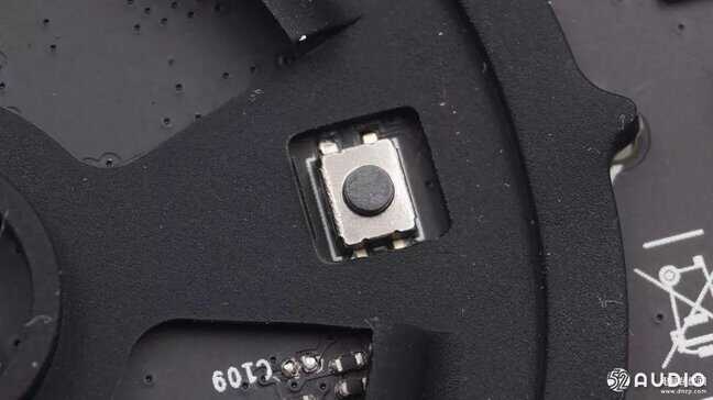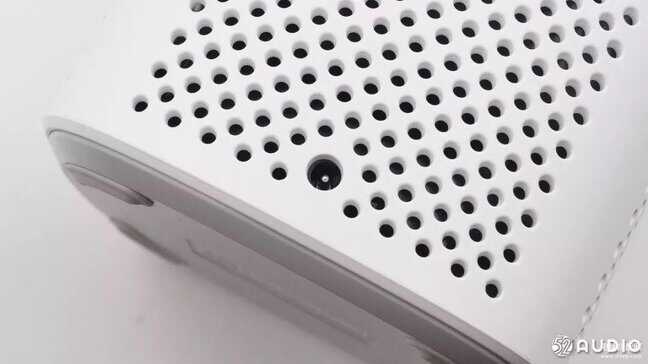 音箱顶部的四个拾音孔和四个物理按键,音量加减按键,静音按键,播放暂停按键。