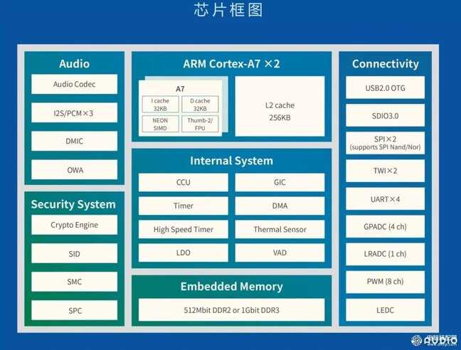 ALLWINNER TECH全志科技R328-S2 SoC。全志R328芯片是全志科技研发的智能语音专用处理器,可以提供语音交互方面的可靠算力,广泛适用于智能音箱、智能家电、智能故事机、语音模组等多种产品形态。