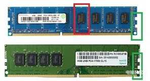 那么近年来主流的 DDR4 内存呢?怎么分辨?如上图中,蓝色内存的是 DDR3,绿色内存的是 DDR4,特征都是小片+方口,但是,从有贴纸的面看,DDR3 的缺口在左边,DDR4 的缺口在右边,此外 DDR4 与历代的内存最大的不同是,DDR4 将内存金手指设计为中间稍突出、边缘收矮的形状。
