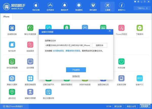 不过很多用户在为此功能设置密码之后,都容易不小心忘记密码,之前只能采用刷机的方式去清除。现在,爱思助手 V7.96 中新增加了一项功能,能够帮助大家破译、找回“屏幕使用时间”的密码。该工具在爱思助手 PC 端“工具箱”中,名为“破解时间限额”,支持破解 iOS 7-iOS 12 系统中的“访问限制”或“屏幕使用时间”密码。若您没有看到该功能,请点击右下角“检查更新”,将爱思助手更新到最新版。
