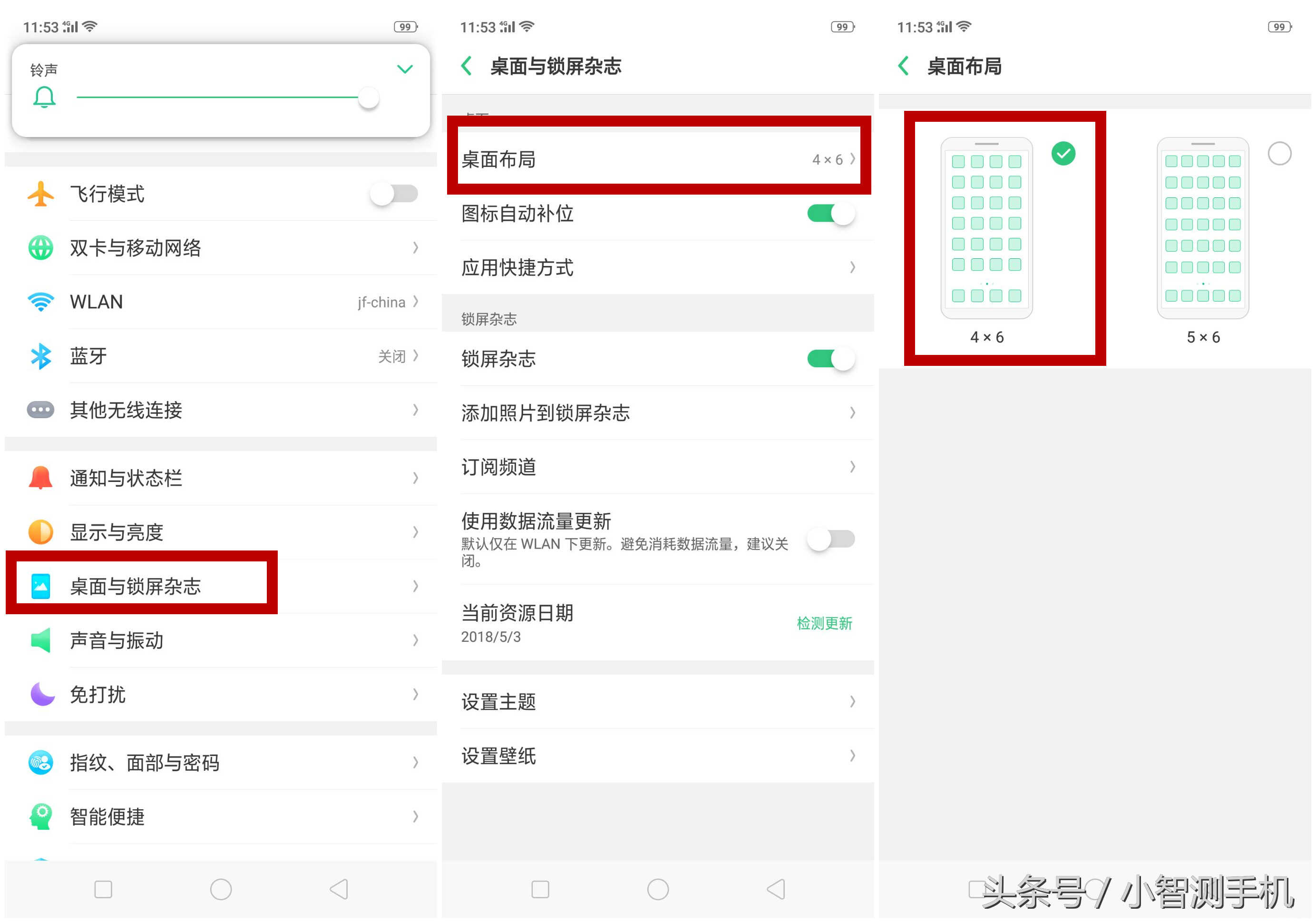 打开设置--桌面与锁屏杂志--桌面布局,如图所示: