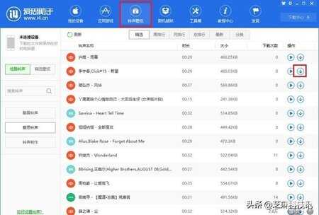 开爱思助手PC端并识别到iPhone,然后在“铃声壁纸”资源中,试听找到一些自己喜欢的铃声,然后点击右侧的下载图标进行下载,如图所示。
