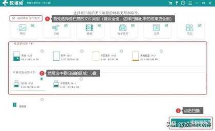 第1步:打开软件首页,关闭【注册页面】。选择要恢复的文件类型(要获得更全面的扫描结果,建议选择全部)和位置(U盘),然后选择【扫描】。