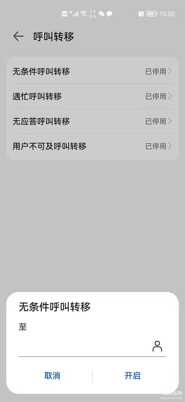 3、选择呼叫转移条件,输入转移电话号码,点击【开启】即可。