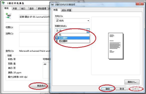 ⑶弹出界面,单击首选项,弹出界面如图,选择长边翻转或者短边翻转(长边翻转用的多),有些打印机是直接选择双面打印,点击应用,在点确定