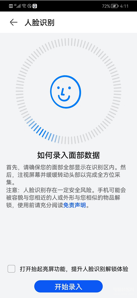 注意:人脸识别存在一定的安全风险。手机可能会被容貌与您相近的人或外形与您相似的物品解锁,使用前请充分阅读免责声明。因此笔者不建议使用“人脸识别”功能,设置有“指纹”、“密码”安全就足够了。