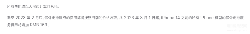 据苹果官网消息, 2023 年 3 月 1 日起,iPhone14 之前的所有 iPhone 机型的保外电池服务费用将上涨 169 元。