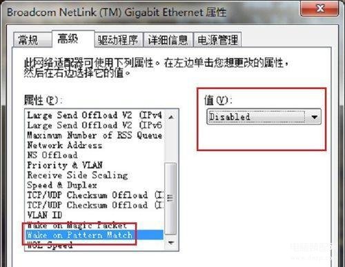 4、点击【高级】,找到【唤醒模式匹配】(wake on pattern match),将右边的值设为【禁用】,点“确定”即可。