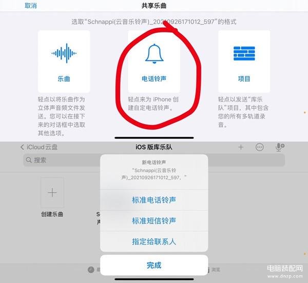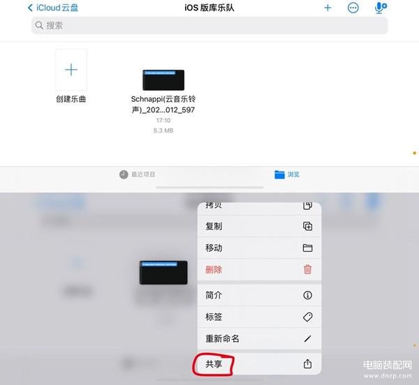 3、在库乐队app中长按音乐,从弹出的窗口中点击共享。