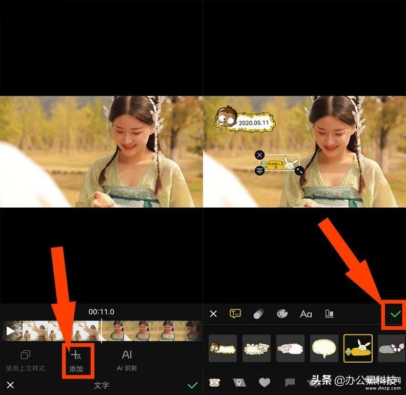 接着我们就会跳转到字幕添加页面,然后我们点击添加,就可以根据自己的需求选择文字的样式、颜色、大小、运动方向等。等你添加完成后,我们直接点击右下角的"√"就能保存设置,而且一个视频可以添加多段字幕哦。