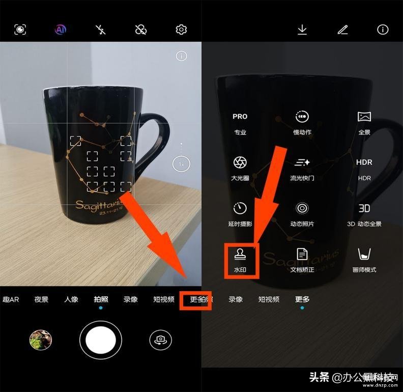 其实有些手机里就自带这种功能,这里就拿华为手机为例,给大家演示具体的操作步骤。先打开手机相机,然后点击下方菜单栏里的"更多",接着再点击"水印"功能即可。