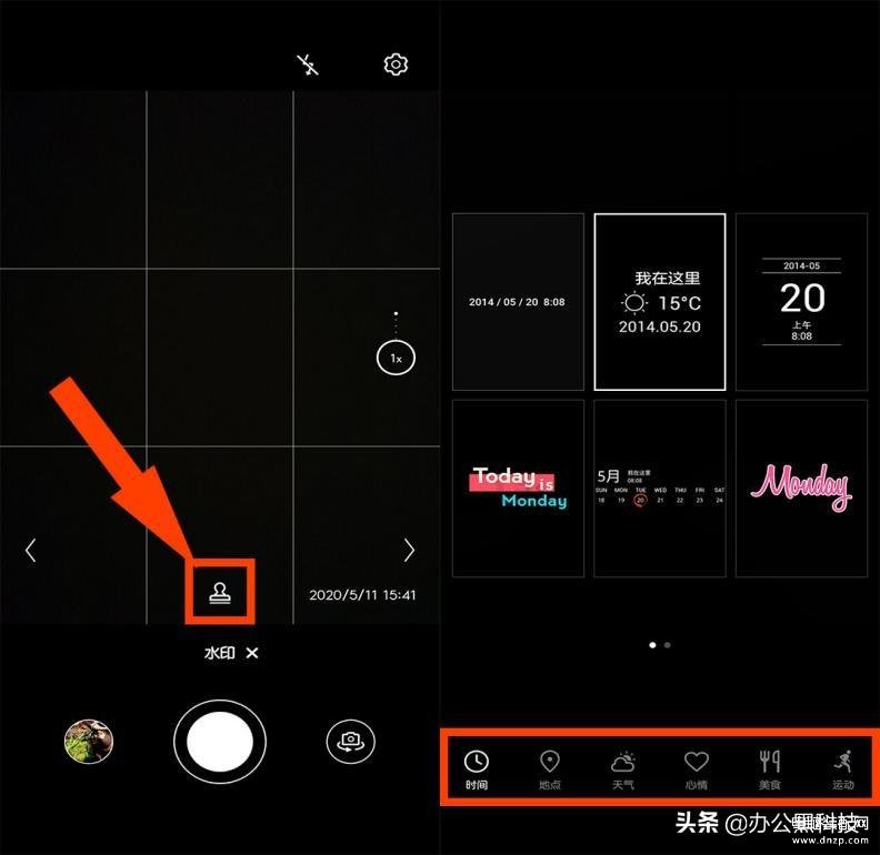 接下来,我们点击中间的小图标,然后就能自行选择添加水印的样式,选好之后,我们拍出来的照片,就会自动带上这个水印了。