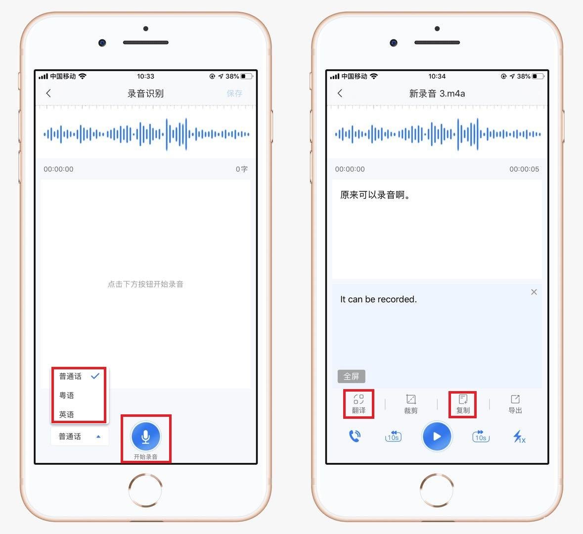 进入这个功能中,点击【开始录音】就可以一边录音一边转成文字,支持普通话、粤语、英语,3种语言识别功能;此外还支持翻译功能,点击【复制】就可以提取录音文本了。