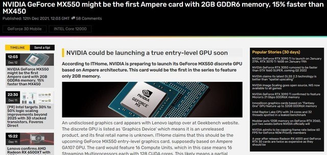 据外媒报道,NVIDIA正准备推出基于Ampere安培架构的GeForce MX550独立显卡,该显卡将是该系列中第一款具有2GB内存的卡。