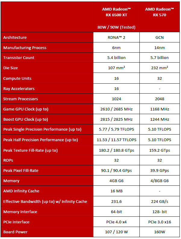 RX 6500 XT基于RDNA 2架构,采用台积电6nm制程工艺,作为一张入门级显卡,在规格上有各种精简。其中的晶体管数量只有54亿,并且将核心面积压缩到了107mm²,共有16组计算单元,1024个流处理器。不过在GPU核心频率上,RX 6500 XT达到了2.6GHz,Boost频率甚至高达2.8GHz。显存方面,配备了4GB GDDR6显存,位宽为64bit,带宽144GB/s,还有16MB Infinity Cache。需要注意的是,RX 6500 XT最高支持PCIe 4.0 ×4,最高功耗120W。