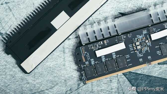 首先是特殊设计的PCB,可以看到PCB顶部有一排梳子状的散热铜片,直接和顶部散热片相连,这种特殊的梳状鳍片能够有效提高内存的散热面积。同时,内存的LED灯珠是和PCB分开的独立模块,这样能够有效降低LED工作时的热量对内存产生影响。