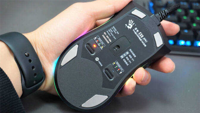 不仅如此,血手幽灵ES9Pro还加入了双飞燕创新的免驱灵敏调校,在鼠标的下方我们可以通过两个按键进行报告率和静默高度切换,125/500/1000/2000HZ四种USB传输报告率可以调换,当然越高的传输报告率指针也更加准确,我们使用时可以根据自己的需要来进行调整。