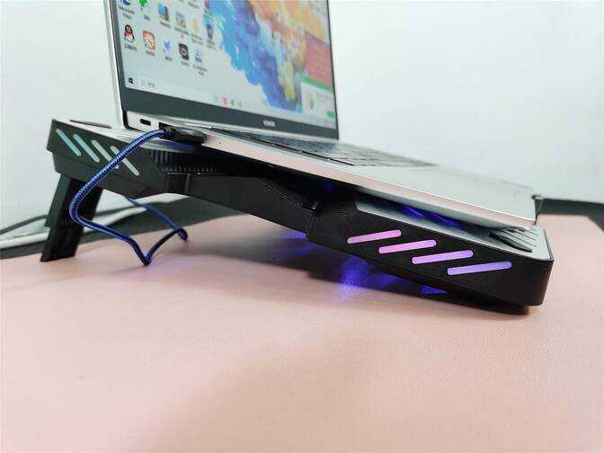 风扇的网格设计防止误伤手指的同时也能防止其他异物侵入。散热垫背部设计的4颗防滑垫有两颗具备伸缩功能,展开可以调整散热垫的角度,一共3档,调节后可以给屏幕3个不同的高度,让视野角度更合理,适用不同的人群,防止肩颈过度劳累造成不适。