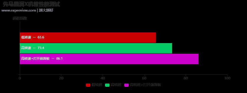 作为一个静音机箱,散热性能并不是先马黑洞X的首要考虑,因此我们对其散热效能的期望本身就不高,高低转速对应的超能指数实际上都在我们的预想范围内,在静音机箱中也算是不错的表现了。不过黑洞X机箱也没有完全放弃自己的散热属性,先马表示如果玩家确实需要更高的散热效能,例如运行大型游戏或者需要硬件长时间的满负载工作时,那么将机箱风扇转速调至高转速档位并打开机箱前面板就可以了。