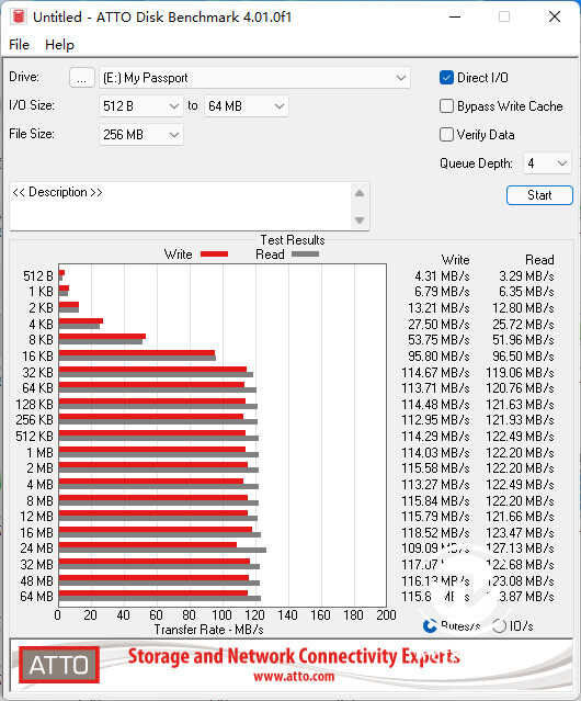 ATTO Disk Benchmark是一款简单易用的磁盘传输速率检测软件,可以用来检测硬盘,优盘,存储卡及其它可移动磁盘的读取及写入速率。该软件采用分级测试模式,让测试结果更加精准可靠。从以上数据我们可以清晰看到WD My Passport 2TB的读取速度达到了123.87MB/s,而写入速度也达到了115.84MB/s。