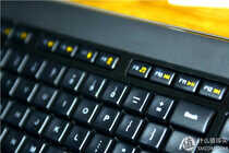 开关设计在右上角,打开开关,旁边的电源指示灯亮起,电量以三段式显示,上图的左边有个小圆点的位置,是光线感应器,作为一款无线背光键盘,对电量的耗用必须要严格控制,加入光线感应器,可以避免在不需要背光的环境中白白消耗电量。