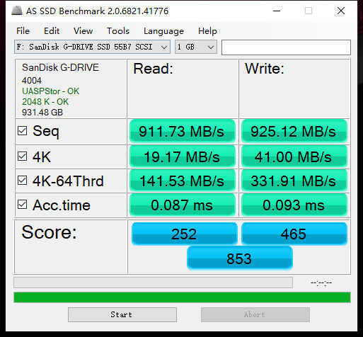 AS SSD Benchmark 测试结果显示,移动固态硬盘顺序读写速度为:911MB/s,925MB/s,4K 读写速度在 20MB/s 和 41MB/s 左右,顺序读写速度基本与宣传中的标称速度一致,4K 读写性能表现也还算不错。