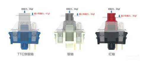 快速触发轴:专门为竞技游戏而生的轴体,触发速度要比其他轴体快得多。最早推出的樱桃银曾因为触发行程太短压力过轻会出现误触的情况,不过目前最新的TTC快银轴已经很好地解决了误触问题。