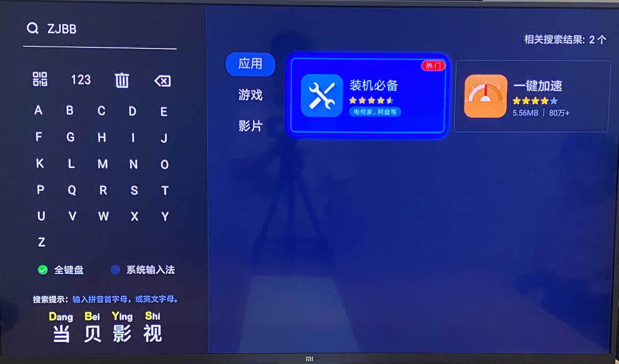 首先在小米电视的官方应用商店里搜索“DBZS”,找到当贝助手后完成安装。