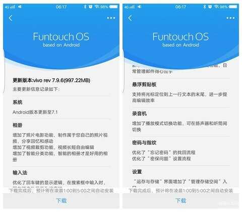 每款机型的升级计划不同,推送的日期安排也有先后,vivo Xplay6的升级推送是本月15日收到的,安装包大小997.22MB,更新版本是rev 7.9.6。