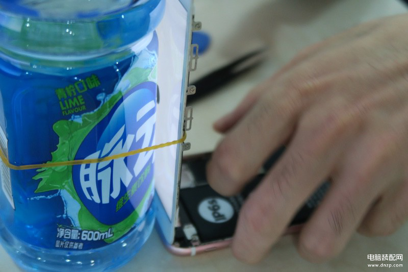紧接着是给大家提供的一个小技巧,我们现在只用换电池,屏幕的排线是固定在上方那块金属片下方的,但是排线长度又太短,没办法把它完全放平,怎么办呢?这个时候就需要饮料瓶登场了(这里请大家联系一下脉动,别忘了把广告费打我账户里去),用橡皮筋把屏幕固定在饮料瓶上,屏幕排线就能安然无恙了!
